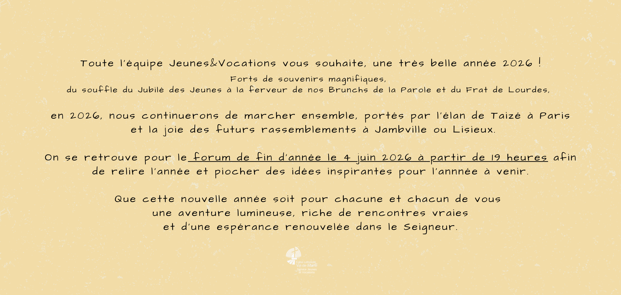 Toute l'équipe du service Jeunes et Vocations vous souhaite une belle année 2026 avec des événements inspirants, missionnaires et pleins d'espérance ! Nous serons encore cette année à vos côtés pour vous encourager !